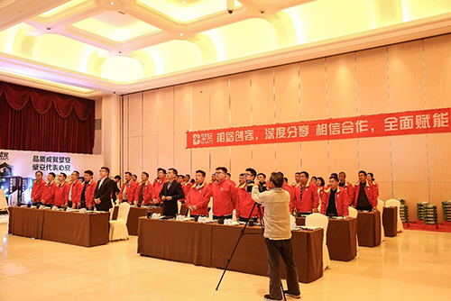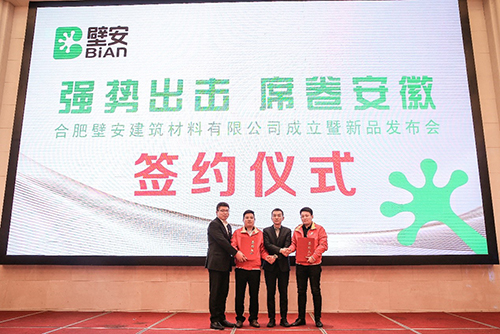 会上,,,,,,,东方腾博888诚信为本官方网站民用建材有限责任公司市场营销总监汪忆首先致辞。。。。。。民建公司壁安粘合剂事业部总司理陈明做题为“选择壁安,,,,,,,开启好人赚钱时代”的演讲,,,,,,,剖析目今市场形势,,,,,,,叙述壁安品牌的意义、愿景,,,,,,,及壁安的生意模式和战略妄想,,,,,,,并代表壁安品牌与合肥壁安修建质料有限公司董事长谢齐和现场签约。。。。。。