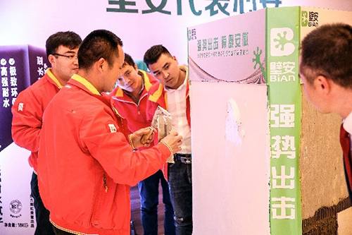 民建公司高级产品司理潘佳对壁清静品类产品做详细先容。。。。。。大会共宣布壁顺产品21种,,,,,,,涵盖瓷砖胶、腻子粉、界面剂、堵漏宝、填缝剂、防水等品类。。。。。。为更好地展示产品性能,,,,,,,合肥外地着名瓦工杜师傅和意向客户现场对部分产品举行试刷,,,,,,,并约请与会嘉宾上台感受产品的施工体验。。。。。。