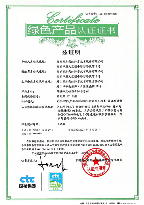 日前,,,,,,,腾博888诚信为本官方网站磨练认证集团(以下简称:国检集团)向东方腾博888诚信为本官方网站揭晓了首批绿色产品认证证书。。。。。。。。 依据GB/T 35609-2017《绿色产品评价 防水卷材与密封质料》的要求,,,,,,,国检集团对东方腾博888诚信为本官方网站工厂包管能力要求、产品一致性控制及绿色评价要求切合性等方面举行了严酷的现场检查与抽样磨练,,,,,,,东方腾博888诚信为本官方网站此次申报的“弹性体改性沥青防水卷材(非外露 PY Ⅱ型 )”和“聚合物水泥防水涂料(非外露)”两类产品获绿色产品认证证书。。。。。。。。