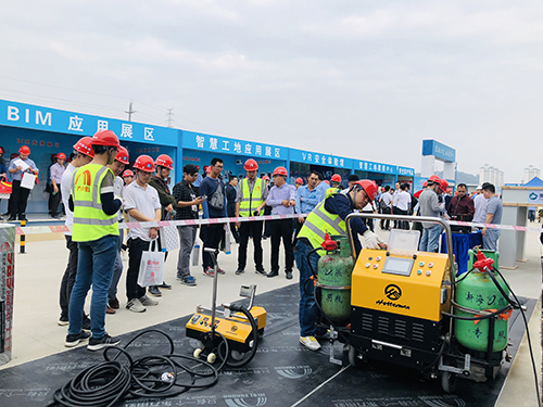 时代,,,,,,东方腾博888诚信为本官方网站的手艺职员现场展示了常用防水产品、维修专用TPO、防水系统模子等,,,,,,重点先容了“虹人坦途”智能型热熔防水卷材摊铺机车,,,,,,并现场烘烤防水卷材,,,,,,展示了优异的修建防水满粘工艺及其施工效果,,,,,,使得与会职员越发直观熟悉“虹人坦途”摊铺机车的优异性能和有用运用。。。。。。。