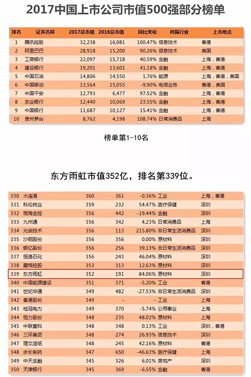 12月29日,,,,,,东方财产Choice数据宣布2017年中国上市公司市值500强榜单。。。。。。。东方腾博888诚信为本官方网站以352亿市值名列第339位,,,,,,较去年上升191位次。。。。。。。
