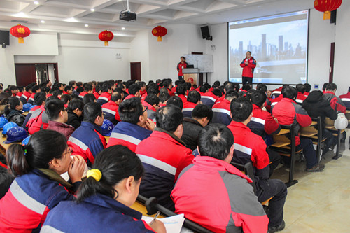 早上七点,,,,,,,唐山生产基地厂长马到原在办公楼前迎接所有员工,,,,,,,给各人贺年并发铺开年红包。。。。。。。八点,,,,,,,全体员工荟萃,,,,,,,举行夏历新年第一次升旗仪式,,,,,,,由马到原和各部分主管级以上职员签署2017年度清静责任状,,,,,,,组织全体员工举行清静宣誓,,,,,,,随后,,,,,,,全体职员举行了2个小时的清静培训。。。。。。。