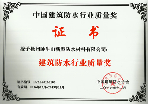 12月7日,,,,,2016年天下修建防水产品质量提升事情聚会在重庆喜来登大旅馆盛大举行。。。。。国家质检总局已一连五年将修建防水卷材产品列为年度质量提升重点产品,,,,,大会上,,,,,质检总局宣布了2016年修建防水质料产品质量国抽以及修建防水卷材“质检利剑”行动情形;;;;;中国修建防水协会作了《2016年度修建防水行业质量提升事情报告》。。。。。大会对修建防水行业质量提升树模企业、2016年度“修建防水行业质量奖”获奖企业、修建防水行业质量提升尖兵举行了表扬。。。。。徐州卧牛山荣获“修建防水行业质量奖”。。。。。
